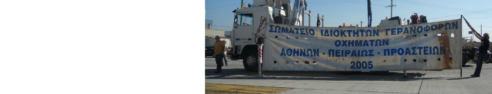 Καλώς ήρθατε στο Σωματείο Ιδιοκτητών Γερανοφόρων Οχημάτων. Ο σκοπός που δημιουργήθηκε το σωματείο, είναι για να προασπίσει τα εργασιακά και ασφαλιστικά συμφέροντα των μελών, την βελτίωση της νομοθεσίας, την καταπολέμηση της παρανομίας στον τομέα των μεταφορών και την τοποθέτησή του στα διάφορα ζητήματα, με γνώμονα το συμφέρον των νόμιμα εργαζομένων μελών του και κατά προέκταση του κοινωνικού συνόλου. Σκοπός μας επίσης είναι η διαρκής επιμόρφωση των μελών, για να αναβαθμιστεί το επίπεδο των υπηρεσιών μας καθώς και η άμεση και διαρκής ενημέρωση σε θέματα νομοθεσίας.